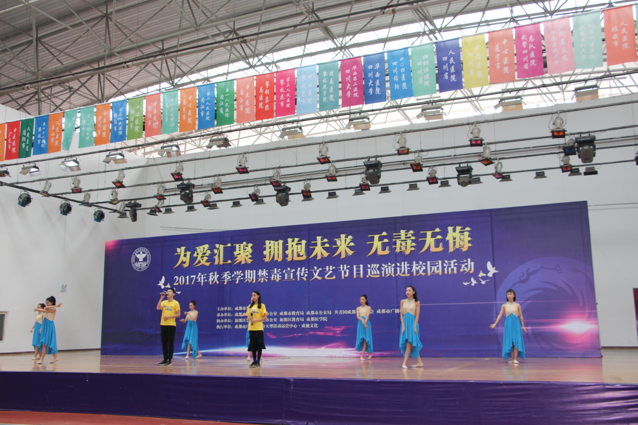 11月2日中午,由我校联合成都市禁毒委员会、成都市广播电视台联办的大型禁毒“舞台剧”—《为爱汇聚·拥抱未来·无毒无悔》,在蜂巢体育馆成功演出,我校近1000余师生员工观看了演出。