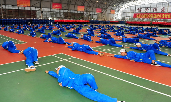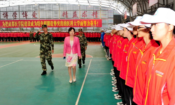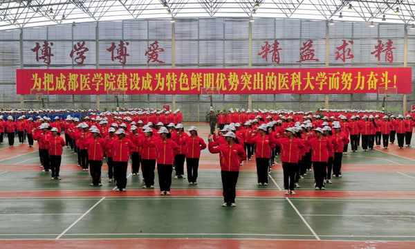 军训方队还进行了男女拳术表演,自编自创曲目《在成医军训的日子》,以及手语操《超越梦想》等。表演气势如虹,汇集了全体新生对成医70岁生日的衷心祝福和对建设医科大学目标的美好祝愿。